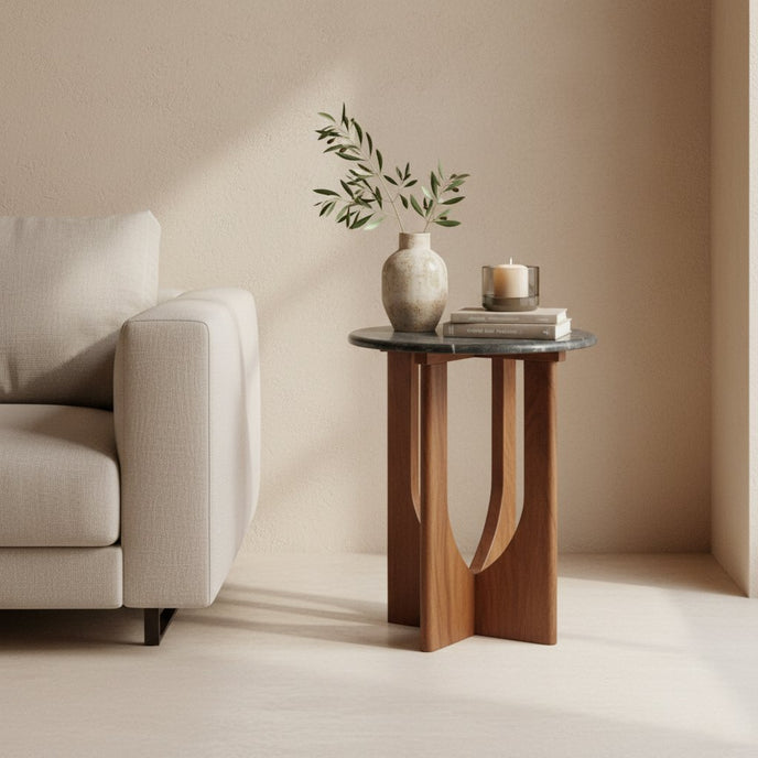 De Brunei bijzettafel marmer zwart brengt een rustig evenwicht in huis. De donkere kleur van het marmer geeft diepte, terwijl het warme mangohout zorgt voor een natuurlijke tegenhanger. Het resultaat is een bescheiden tafel die opvalt door eenvoud en karakter — een toevoeging die in elk modern, Japandi of industrieel interieur zijn plek vindt.