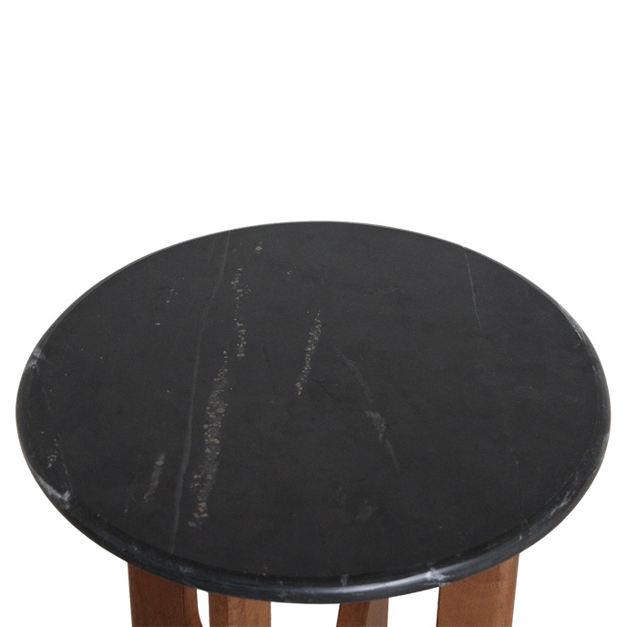 Het tafelblad is van zwart marmer, met subtiele aders die elk exemplaar uniek maken. Geen enkel blad is hetzelfde, waardoor elke tafel zijn eigen gezicht heeft. Het onderstel van bruin mangohout is stevig en natuurlijk van kleur, met zichtbare nerven die het hout levendig houden. Het hout komt van mangobomen die na hun vruchtperiode opnieuw worden gebruikt — een duurzame keuze met een warm verhaal.