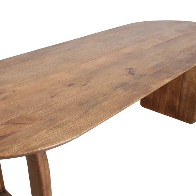De moderne Bullnose eettafel is gemaakt van massief mangohout en springt in het oog door zijn organische ontwerp. De afgeronde vormen aan de zijkanten en de onderkant van het blad geven de tafel een zachte, eigentijdse uitstraling. Je kunt kiezen uit verschillende onderstellen, waardoor de tafel altijd aansluit bij jouw woonstijl. Verkrijgbaar in zowel zwart als bruin.