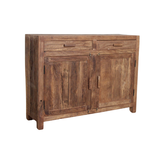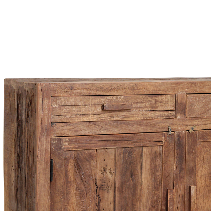 Het dressoir combineert praktische opbergruimte met een karaktervolle uitstraling. Het gerecyclede hout en de zichtbare details maken elk exemplaar uniek, waardoor het een stijlvolle en authentieke toevoeging is aan je interieur.