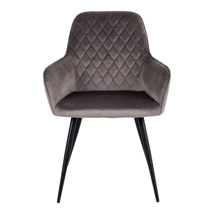 De Harbo Dining Chair heeft een zachte fluwelen zitting in een lichtbruine (paddenstoel)kleur en zwart metalen poten. Deze stoel biedt comfortabele zitplaatsen en een stijlvolle, eigentijdse uitstraling, geschikt voor diverse eetruimtes. Deze stoel wordt geleverd in een set van 2.