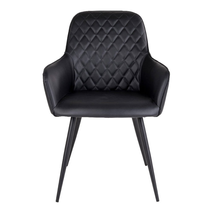 De Harbo Dining Chair heeft een zwarte PU-leren zitting met een gewatteerd patroon en zwart metalen poten. Deze stoel biedt comfortabele zitplaatsen en een stijlvolle, veelzijdige uitstraling, geschikt voor diverse eetruimtes. Deze stoel wordt geleverd in een set van 2.