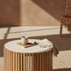 De tafel is gemaakt van duurzaam Sungkai hout uit Indonesië, bekend om zijn lichte gewicht en kenmerkende lichtgele tot lichtbruine kleur. Het blad is vervaardigd uit hoogwaardig marmer, dat direct een luxueuze en natuurlijke uitstraling toevoegt aan je interieur.